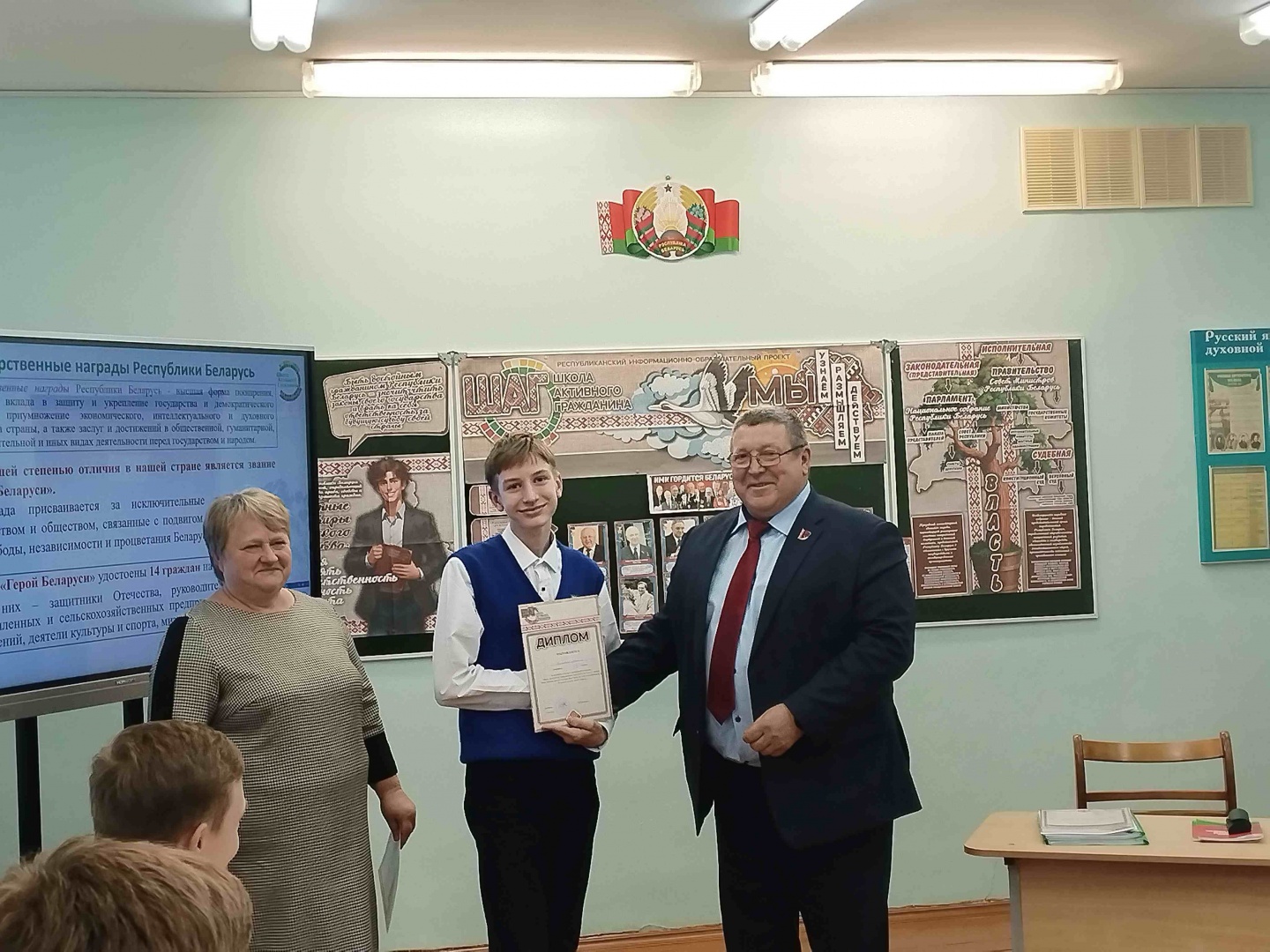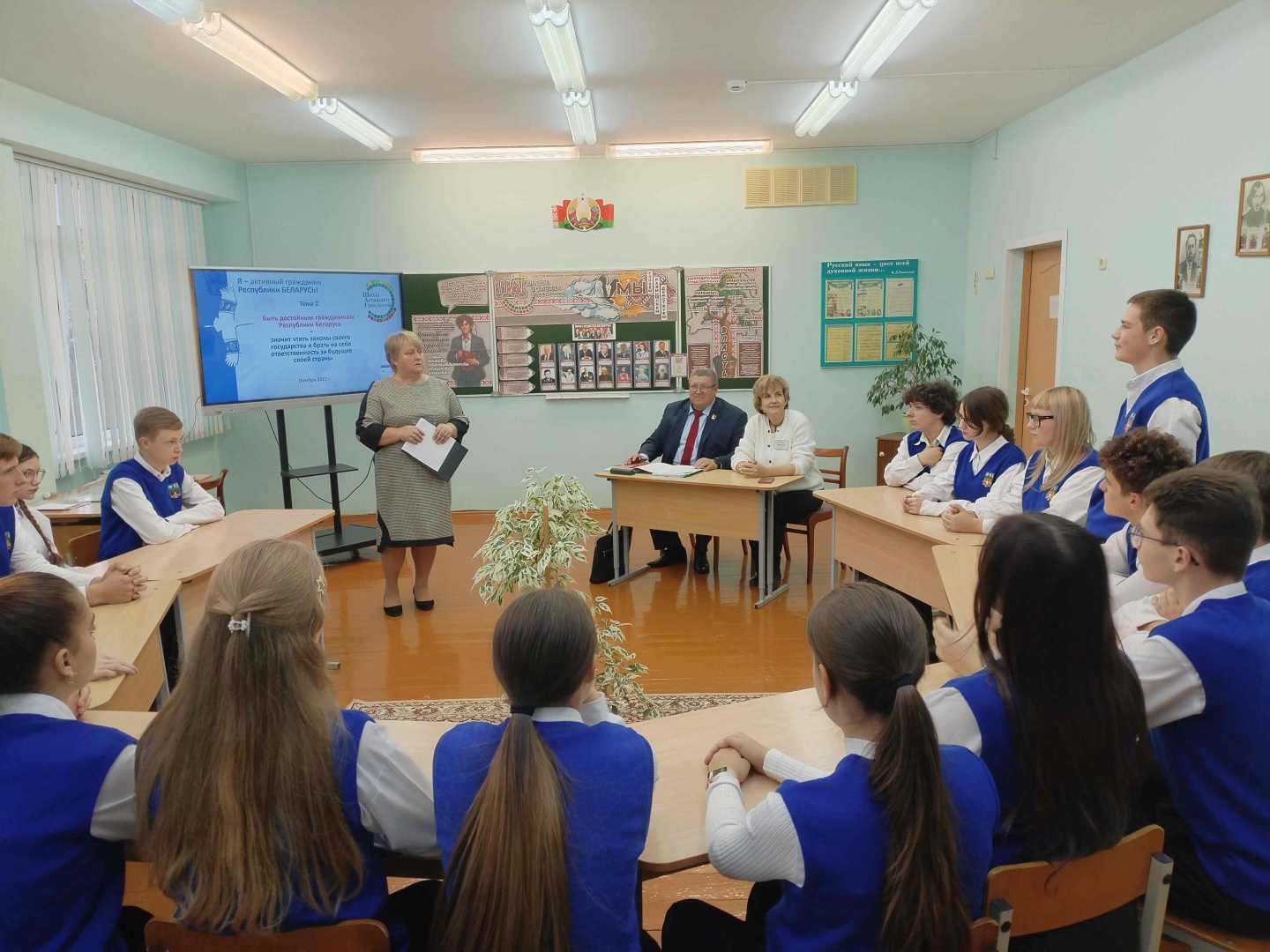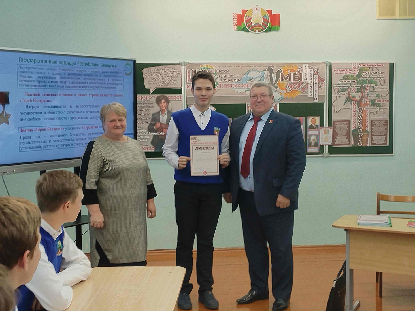 В фокусе обсуждения Конституция Беларуси, Президент страны, Всебелорусское народное собрание, ветви государственной власти, государственные награды и премии. У делегата Всебелорусского народного собрания Валерия Эдуардовича Павлюкевича, школьники интересовались работой Всебелорусского народного собрания, уточнили функции и значение ВНС.